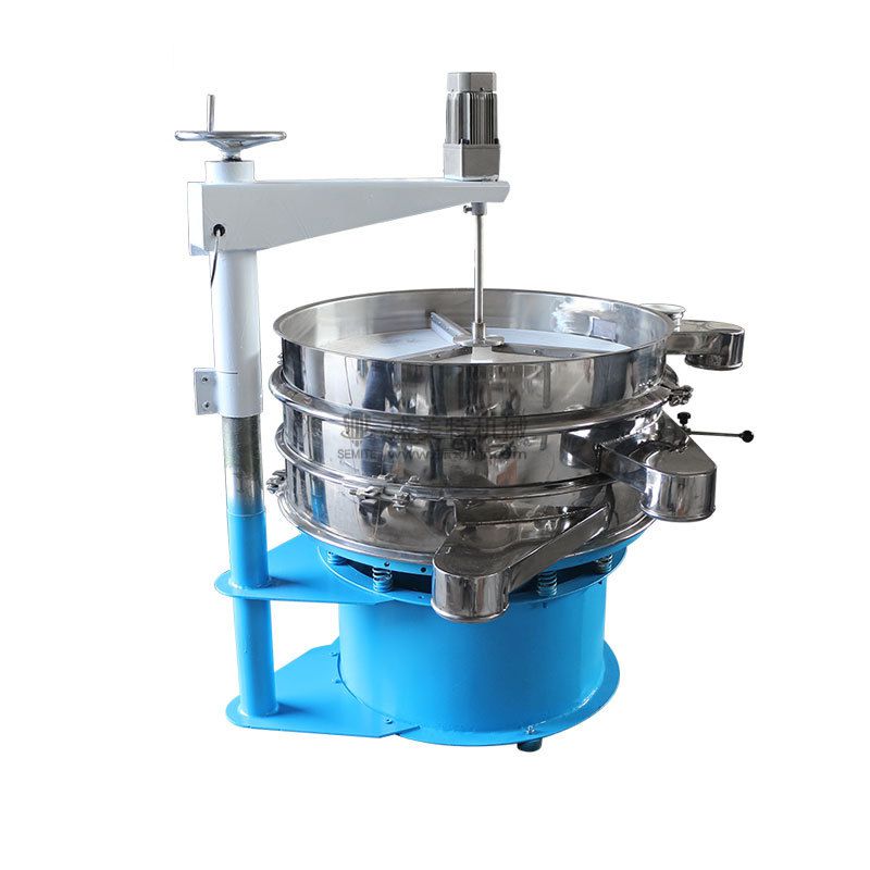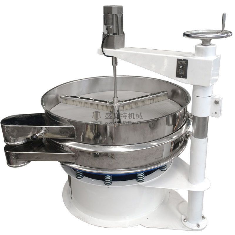 強制篩也叫刮板篩、強制式振動篩帶毛刷的旋振篩,是新鄉市盛美特機械設備有限公司根據客戶遇到的篩分難題而專門研發設計的一款新型篩分設備,其主要特點是在原有的旋振篩設備甚而上增加了強制裝置,在于安裝了不銹鋼刮板(也可安裝毛刷),便于加強振動篩篩網的自清潔功能,解決了物料油性大、粘性大、結團的含靜電的物料,在外置強制裝置打散物料直接的抱團,從而以高效篩分物料。 例如在面粉篩分中,有些細渣子易于掉落在網孔中,在刮板旋轉推動的作用下,可以將雜質推向出料口,自動排出,減少了堵網的發生。
